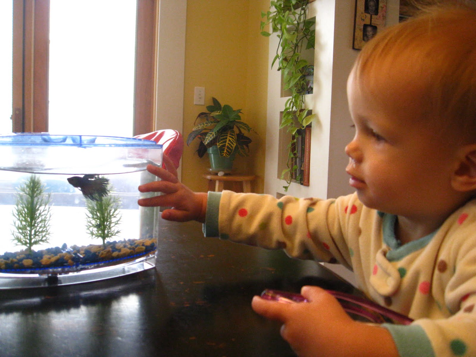 The first few are of my crazy baby. I never want to forget her WILD fuzzy hair. I also want to remember her LOVE of treats...especially Swedish Fish :) Speaking of fish, that one she's looking at is our new pet...Jazzy.